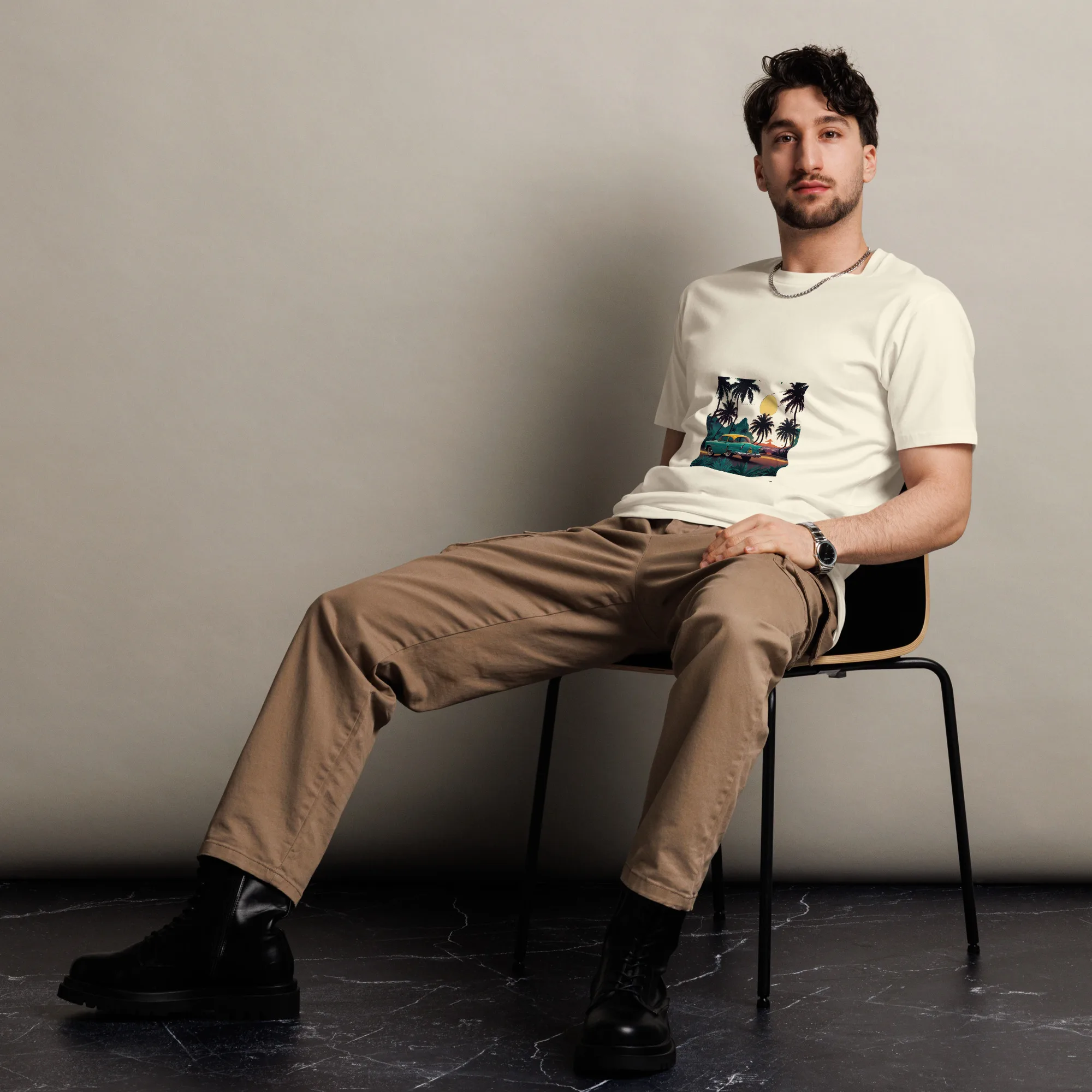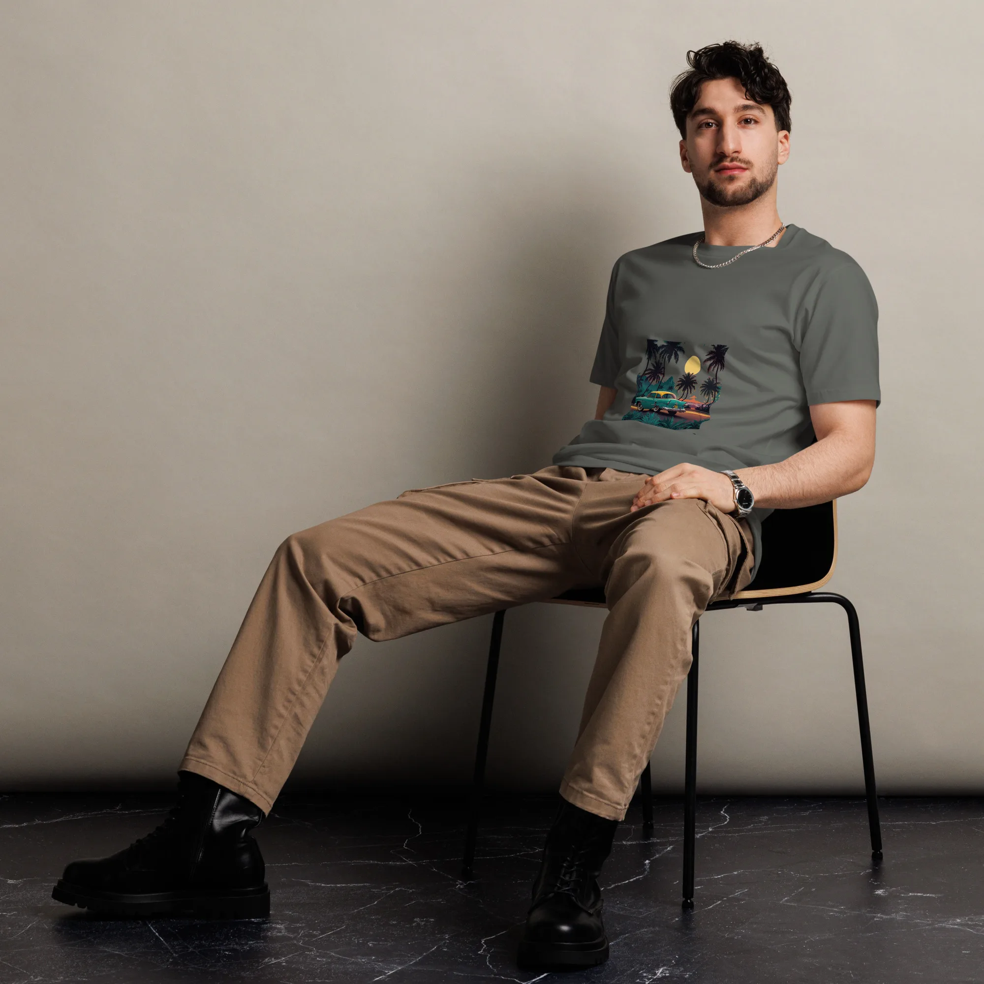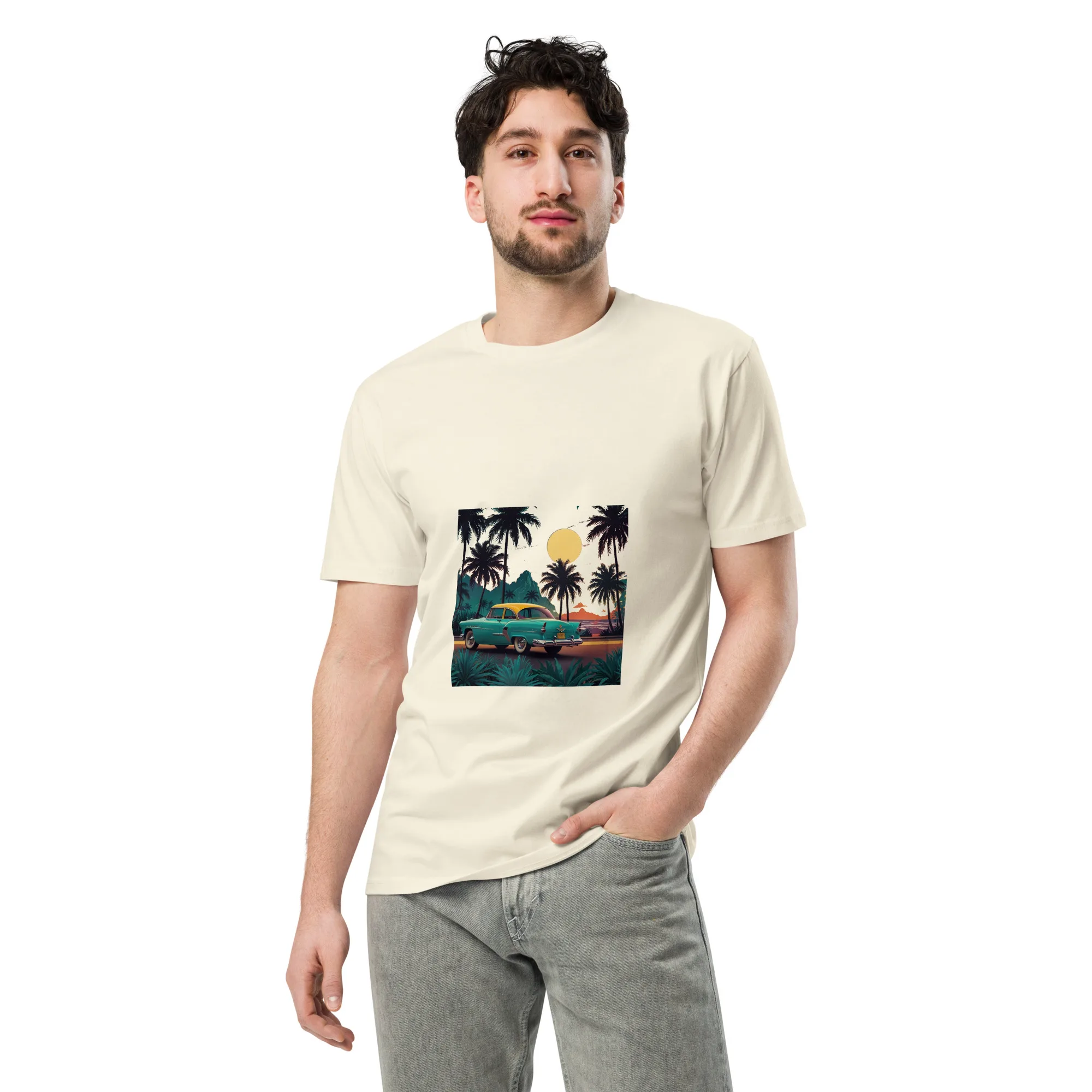 A light-toned canvas that carries the soul of endless summers: a winding coastal road, a classic vintage car, palm leaves framing the scene. It’s not just a graphic, it’s an invitation to a lifestyle where the ocean hums as your soundtrack, and freedom feels like wind through open windows.